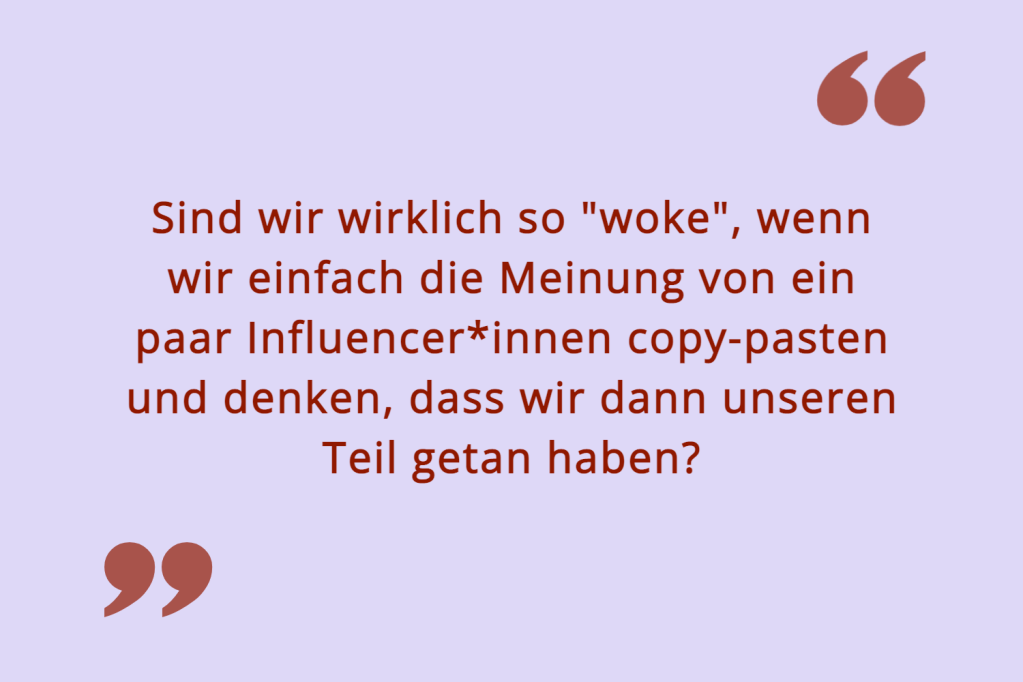 Trotzdem stört mich, dass wir uns den ganzen Tag über all das Schlimme in der Welt aufregen und dann meinen, wir könnten etwas verändern indem wir Insta-Postings teilen. Denn: Sind wir wirklich so „woke“, wenn wir einfach die Meinung von ein paar Influencer*innen copy-pasten und denken, dass wir dann unseren Teil getan haben? Erreichen wir damit nicht auch wieder nur die, die sich in derselben politischen Bubble bewegen? Die unsere Meinung sogar teilen und sich nun aber unter Druck gesetzt fühlen, den gleichen „Aktivismus“ zu betreiben?