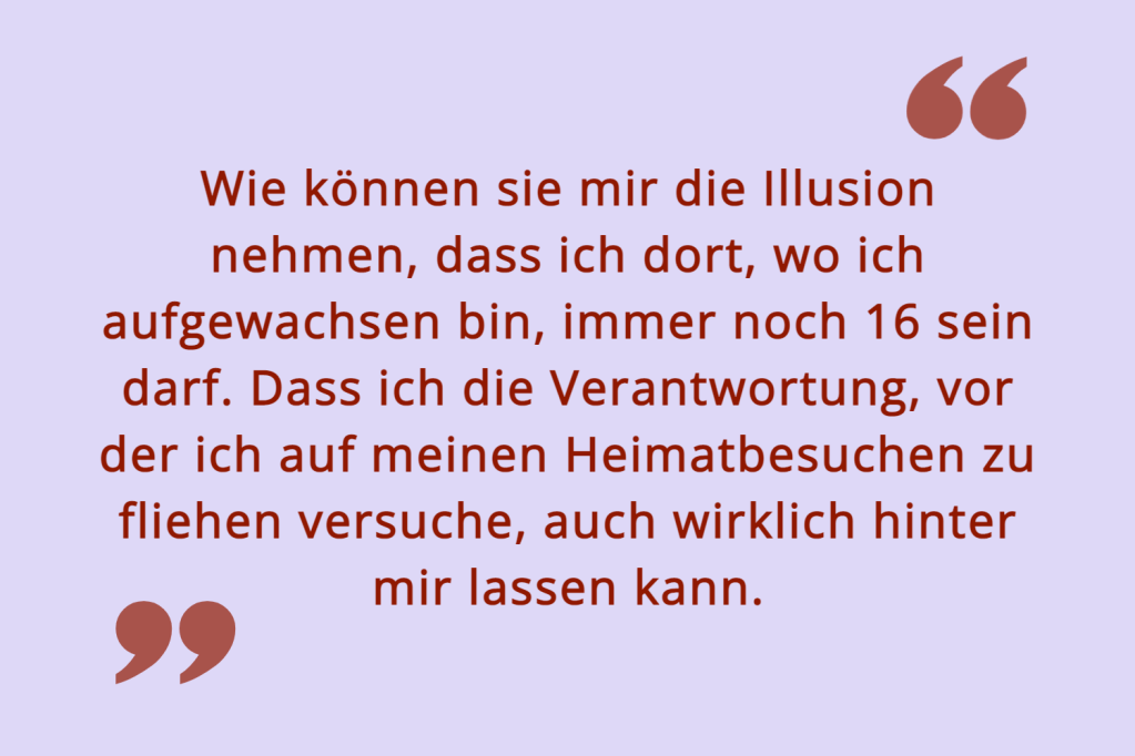 Aber hin und wieder ist da diese kleine, nervige Stimme in meinem Hinterkopf, die schreit “Wie können sie nur?” Wie können sie mir die Illusion nehmen, dass ich dort, wo ich aufgewachsen bin, immer noch 18 oder auch 16 sein darf. Dass ich die Kleine in meiner Familie sein darf, das Nesthäkchen, um das sich alle immer irgendwie kümmern. Dass ich mich mit meinen Mädels immer in den gleichen, winzigen Kinderzimmern treffen werde, die Wände tapeziert mit den schrecklichen Bildern von einem Fotoshooting unserer 14-jährigen Ichs und wir alles mit den anderen teilen können. Dass ich dort die Verantwortung, vor der ich bei meinen Heimatbesuchen zu fliehen versuche, auch wirklich hinter mir lassen kann.
