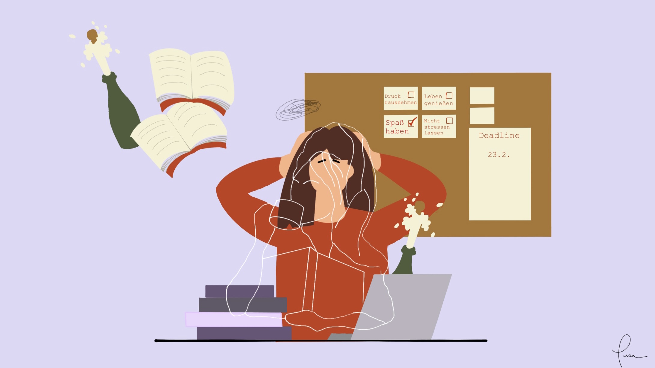 Wenn ich die Prüfungen nicht gut hinbekomme, versaut es mir nachher noch meine Gesamtnote. Ich brauche doch gute Noten. Man muss herausstechen. Jetzt ist schon Donnerstag. Wie soll ich sonst einen Job finden, der zu mir passt, meinen Lebensunterhalt, irgendwann vielleicht eine Familie, meine Wohnung, meinen Sekt, mein Essen, meinen Druckausgleich finanziert? Zum Glück bin ich noch SO jung und hab Zeit. Gar kein Druck. Samstagnachmittag. Erstmal noch einen Tatort schauen – Ablenkungsdruck. (Mist, wieder nicht bei der Ärztin angerufen. Montag dann.)