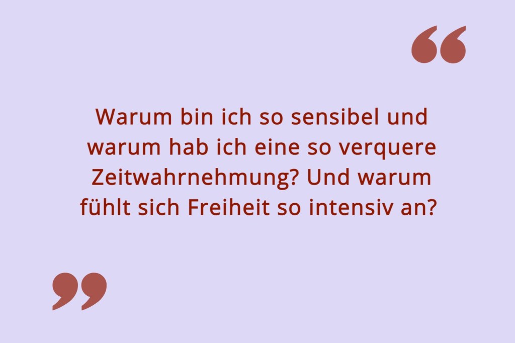 Kleiner Spoiler: Wir haben unsere alten Ichs dann doch relativ schnell wiedergefunden. Aber im Laufe der Zeit kamen immer mehr Reizüberflutungen dazu, die ich so noch nicht kannte. Warum bin ich so maximal überladen mit Glücksgefühlen, wenn ich mit vielen Menschen auf einem Haufen sitze? Warum spüre ich gleichzeitig aber social anxieties, die ich bisher nie hatte? Warum bin ich so sensibel und warum hab ich eine so verquere Zeitwahrnehmung? Und warum fühlt sich Freiheit so intensiv an?