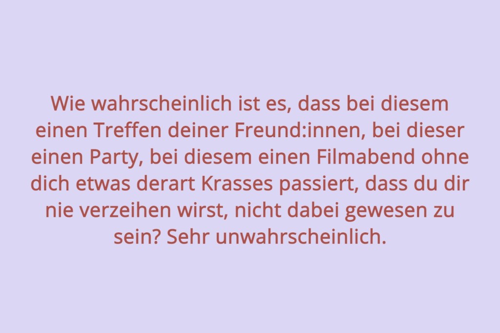 Aber warum ist das so? Warum denkt man immer, sobald man einmal nicht dabei ist, passiert irgendetwas Weltbewegendes, das man verpasst? Obwohl man doch genau weiß, dass es noch Tausende solcher Treffen geben wird. Vielleicht liebe ich meine Freund:innen einfach nur so sehr, dass es mich innerlich auffrisst, wenn mir eine Möglichkeit entgeht, mit ihnen Zeit zu verbringen. Vielleicht ist das aber auch nur richtiger Cheesy-Bullshit und ich bin einfach süchtig nach Kontrolle und fürchte mich vor dem Gefühl des Ausgeschlossenwerdens.