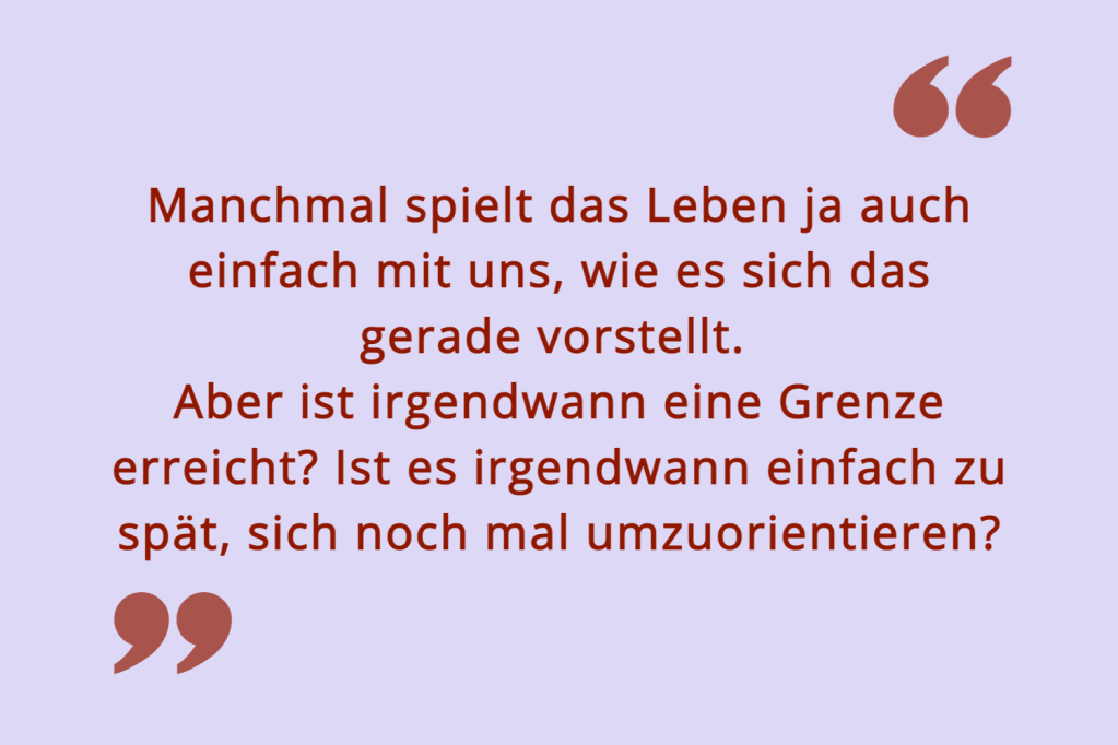 Gespräche mit solchen Leuten lassen mich ein bisschen weniger lost fühlen, ein bisschen mehr, als wäre es okay, jetzt noch nicht zu wissen, wohin der Weg noch führen wird. So genau kann das wahrscheinlich sowieso kaum jemand von seiner Zukunft sagen. Und manchmal spielt das Leben ja auch einfach mit uns, wie es sich das eben gerade vorstellt. Aber ist irgendwann eine Grenze erreicht? Ist es irgendwann einfach zu spät, sich noch mal umzuorientieren?