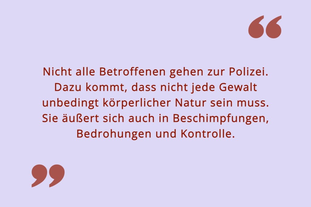 Die Fallzahl der Partnerschaftsgewalt ist exorbitant hoch. 2020 wurden allein 148.031 Fälle erfasst. Davon waren 119.164 weibliche und 28.867 männliche Opfer. Es ist davon auszugehen, dass die Dunkelziffer auf beiden Seiten weitaus höher ist. Nicht alle Betroffenen gehen zur Polizei. Dazu kommt, dass nicht jede Gewalt unbedingt körperlicher Natur sein muss. Sie äußert sich auch in Beschimpfungen, Bedrohungen und Kontrolle.