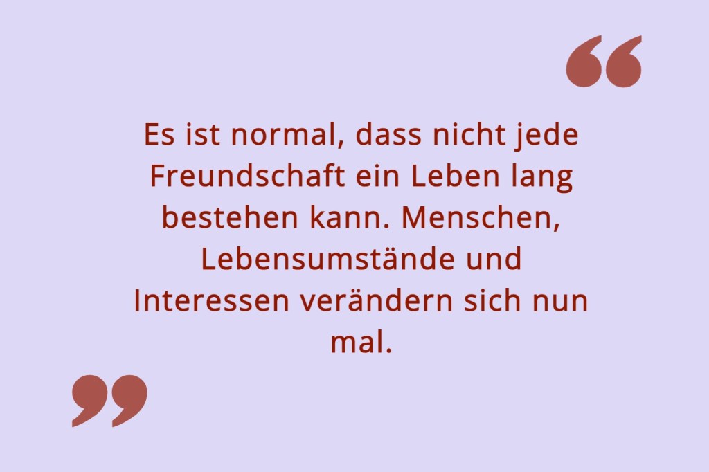 Es ist normal, dass nicht jede Freundschaft ein Leben lang bestehen kann. Menschen, Lebensumstände und Interessen verändern sich nun mal. Und selbst wenn ich jeder/m meiner Freund:innen vom Fenster aus zuwinken kann, ist das natürlich kein Garant für eine lebenslange Verbindung. Dann bin ich froh über diesen kleinen fatalistischen Teil in mir, der davon überzeugt ist, dass es sowieso immer einen Grund dafür gibt, wenn Menschen mein Leben verlassen.