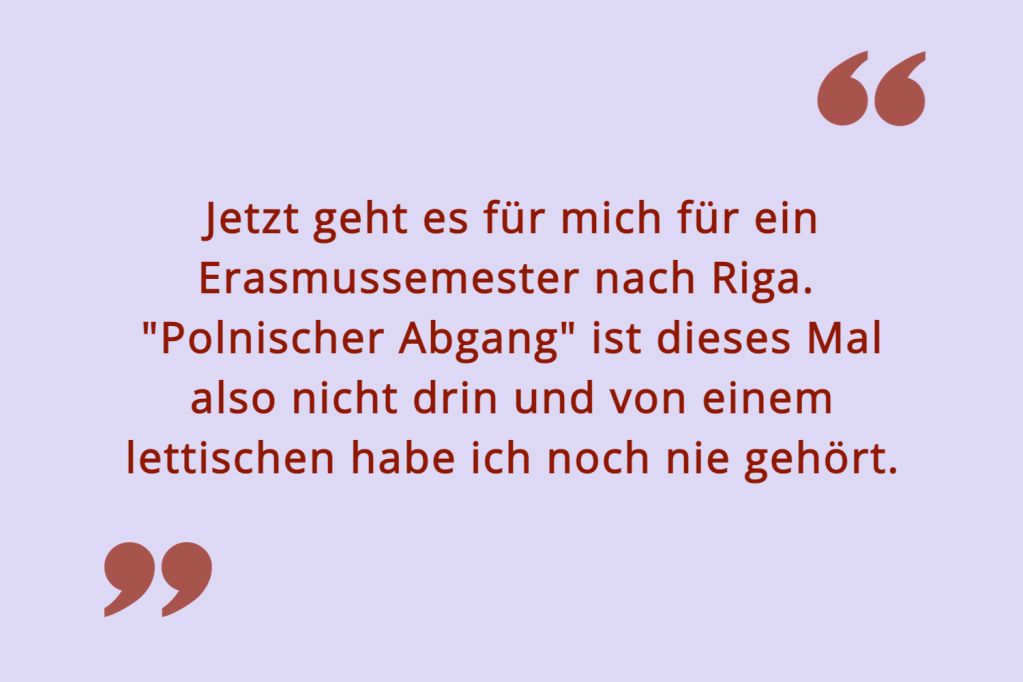 Aber jetzt geht es für mich für ein Erasmussemester nach Riga. „Polnischer Abgang“ ist dieses Mal also nicht drin und von einem lettischen habe ich bisher noch nie gehört. Dass die Verabschiedung jetzt für ein halbes Jahr ist, macht für mich alles noch undurchschaubarer. Klar, einerseits ist ein halbes Jahr schon eine lange Zeit. Vor allem, wenn ich an Personen denke, die ich sonst eigentlich wöchentlich oder sogar täglich sehe. Es wird in der Heimat so viel passieren und ich werde nicht dabei sein, es vielleicht teilweise nicht mal mitbekommen. Sicher wird sich auch einiges verändern – wäre ja schlimm, wenn nicht.