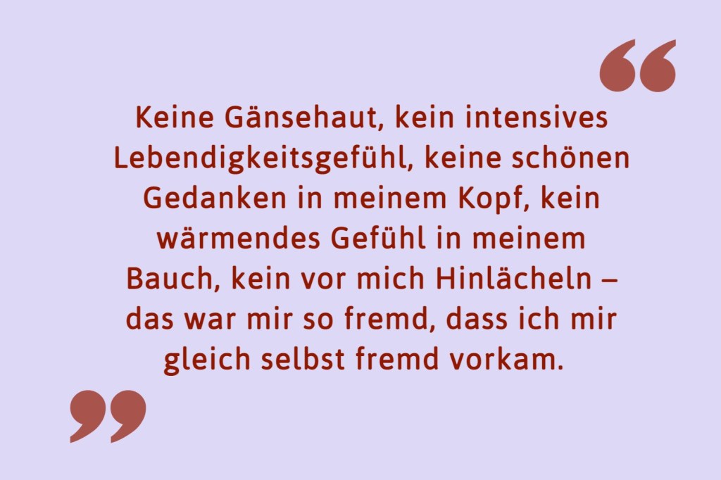 Viel später habe ich mich gefragt, ob das überhaupt noch etwas mit Hochsensibilität zu tun hat. Oder ob das bei mir nicht längst irgendeine Sucht ist, nach Extremgefühlen, nach Mich-lebendig-fühlen, zwanghafte Flucht aus der Monotonie? Vielleicht auch einfach nur mein Persönlichkeitstyp? Ob diese ständige Überstimulation nun gesund ist oder nicht, normal ist oder nicht – keine Ahnung – ist mir aber auch egal. Ich will weiterhin viel träumen, viel denken, viel fühlen, nur definitiv ein bisschen weniger für andere.