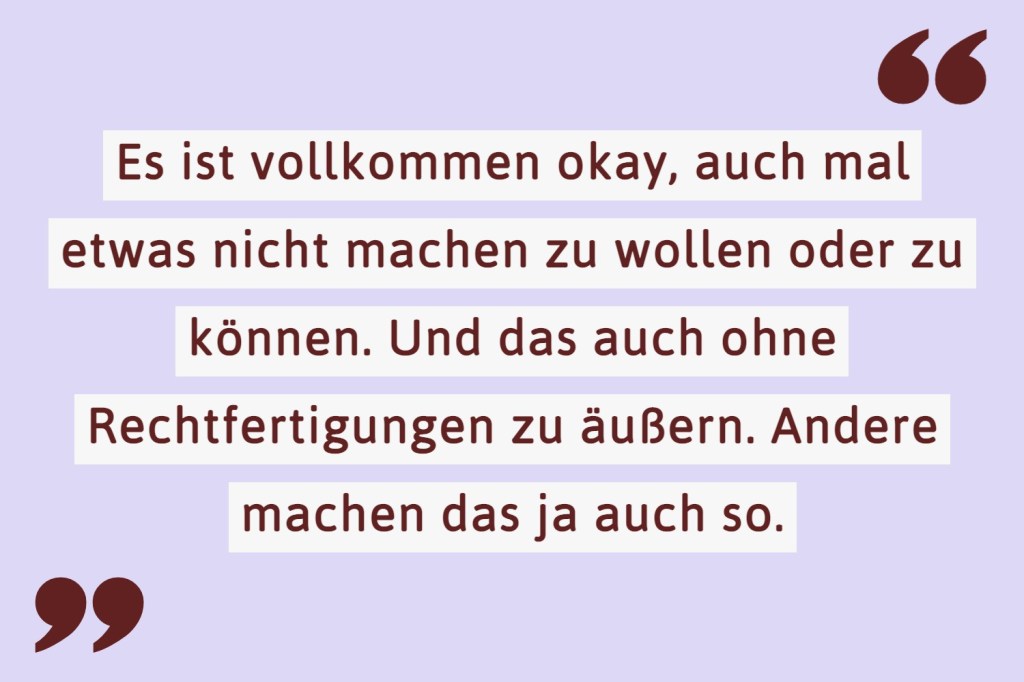 Als ich mich deshalb wortwörtlich bei meiner Therapeutin ausgeheult habe, hat sie mir das eigentlich Offensichtliche geraten: Wenn ich merke, dass ich eigentlich keine Lust oder keine Zeit für etwas habe, soll ich dem auch Raum geben, anstatt es zu unterdrücken. Es geht dabei vor allem darum, herauszufinden, was ich stattdessen will. Auch wenn die Angst da ist, jemanden zu verletzen oder dafür verurteilt zu werden. Denn es ist vollkommen okay, auch mal etwas nicht machen zu wollen oder zu können. Und das auch ohne Rechtfertigungen zu äußern. Andere machen das ja auch so.