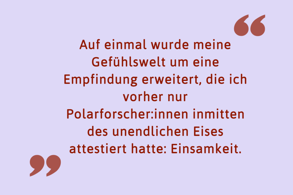 Es hat ein halbes Jahr, einen Umzug und einen Masterstudiengang gebraucht, bis ich aus diesem fatalistischen Gefühl Motivation schöpfen konnte und mir endlich eingestand, dass ich neue Kontakte brauchte – und einsam auf der Couch rumzuliegen, garantiert keine Lösung mehr war. Ich habe mir Bumble Friends runtergeladen, aktiv Kommiliton:innen bei Zoom angeschrieben und kaum eine Gelegenheit ausgelassen, Menschen nach Kaffeedates zu fragen. Zugegeben, ständig sozial aktiv zu sein, kann auf Dauer ziemlich anstrengend sein, hat mir aber die besten Freund:innen auf Erden beschert. Und mich eine ganze Ecke umsichtiger gemacht. Durch die vielen Gespräche in meinem neuen Umfeld habe ich erfahren, wie viele Menschen sich – insbesondere während Corona – einsam fühlen oder gefühlt haben. Und dass man es vielen von ihnen – wie mir – wahrscheinlich nicht angemerkt hat.