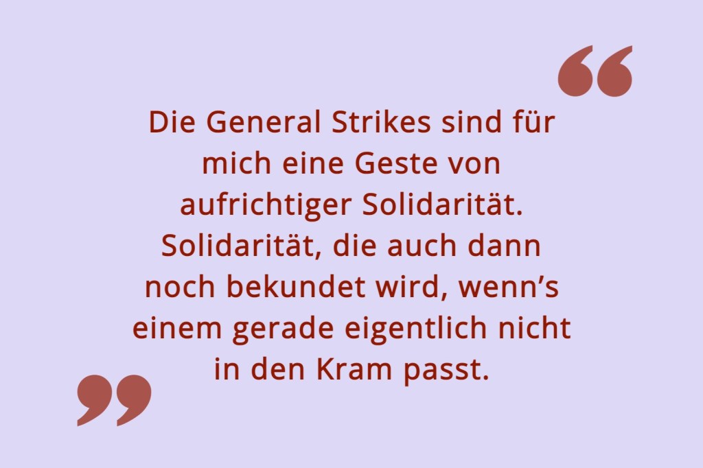 Aber Streik bedeutet nicht nur einen Tag frei machen und trauern. Streik bedeutet für manche Menschen eben auch, nicht genug Geld oder Essen für den Tag zu haben. Ein Freund erzählt mir, dass Verantwortliche an Streiktagen durch die Straßen gehen, darauf achten, dass die Läden geschlossen bleiben und Essen an Bedürftige verteilen. Die General Strikes sind für mich eine Geste von aufrichtiger Solidarität. Solidarität, die auch dann noch bekundet wird, wenn’s einem gerade eigentlich nicht in den Kram passt. Das sticht mir noch mehr ins Auge, wenn ich an Deutschlands peinlichen Auftritt bei der WM in Qatar zurückdenke.