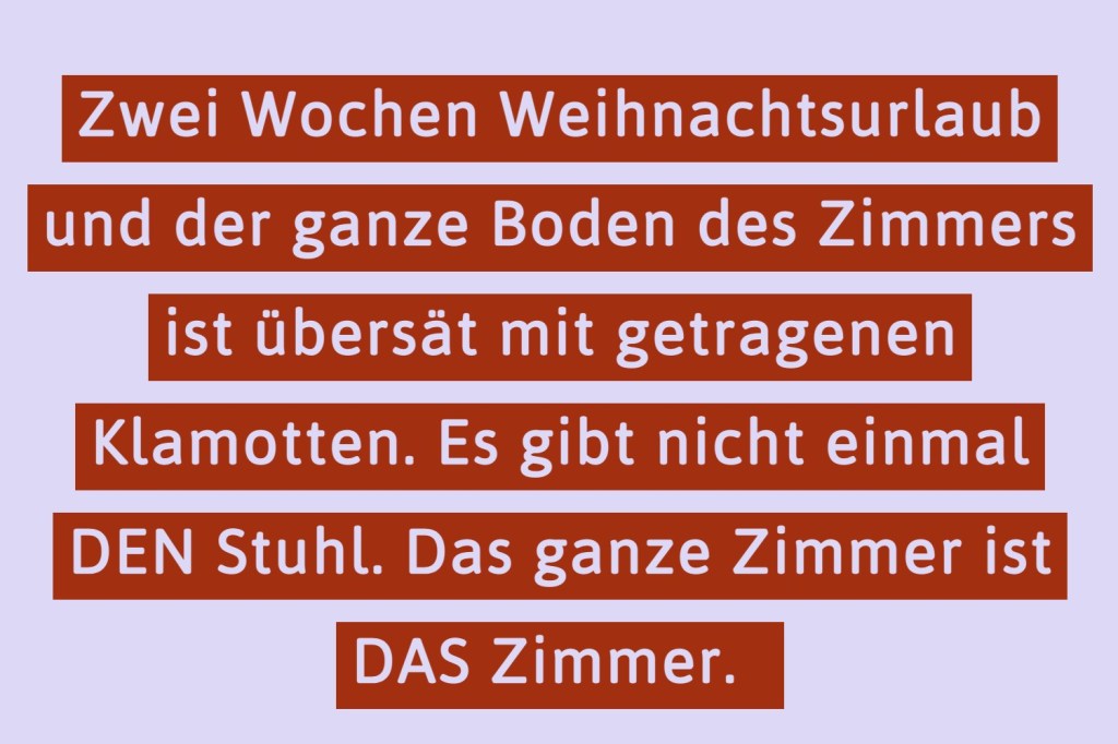 Wenn ich meine Familienmitglieder und meinen Freund fragen würde, wie das Zusammenleben mit mir ist, dann wären sie sich alle einig: Es kann ziemlich anstrengend sein. Nicht, weil ich keine lustige Zeitgenossin bin, sondern weil es mit mir sehr schnell sehr unordentlich wird. In der Heimat treibe ich meine kleine Schwester in den Wahnsinn, indem ich meine Dreckwäsche morgens nach dem Duschen tagelang auf dem Badezimmerboden liegen lasse. Zwar könnte ich mich auch einfach kurz bücken und meine Wäsche zwei Meter gen Westen in mein Kinderzimmer tragen. Aber auch hier sieht es nicht anders aus. Zwei Wochen Weihnachtsurlaub und der ganze Boden des Zimmers ist übersät mit getragenen Klamotten. Es gibt nicht einmal DEN Stuhl. Das ganze Zimmer ist DAS Zimmer.