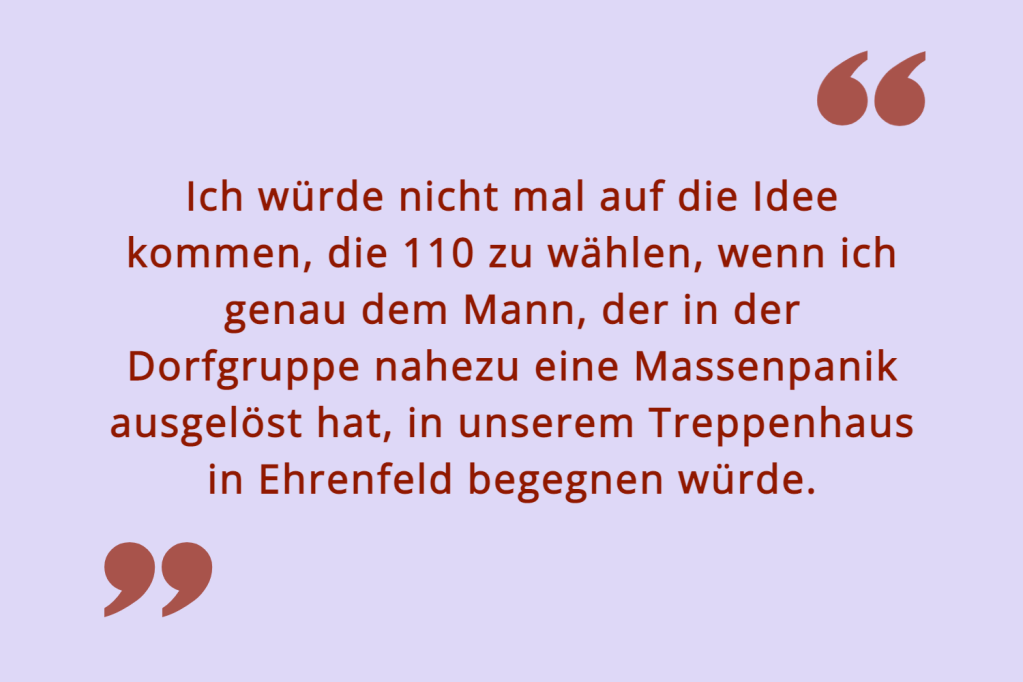 Hier will ich erwähnen, dass eine Frau der Dorfgruppe auch mitgeteilt hat, dass sie den unbekannten Mann mal ansprechen würde und fragen, ob er denn Wasser oder etwas zu essen bräuchte. Daumen hoch gab es dafür nicht. Ich war schon dabei, eine Diskussion mit meiner Familie vom Zaun zu brechen. Warum haben eigentlich nicht mehr Menschen wie diese Frau reagiert, sondern sind direkt vom Schlimmsten ausgegangen und haben einen Polizeieinsatz gefordert? Wenn ich in Köln jedes Mal die Polizei alarmieren würde, sobald ein fremder Mensch an meiner Wohnung vorbeiläuft, würde ich sonst zu nichts anderem mehr kommen – und die Polizist:innen im Übrigen auch nicht. Ich würde nicht mal auf die Idee kommen, die 110 zu wählen, wenn ich genau dem Mann, der in der Dorfgruppe nahezu eine Massenpanik ausgelöst hat, in unserem Treppenhaus in Ehrenfeld begegnen würde. Aber wenn ich ihn in meinem Heimatdorf treffen würde … Die Polizei würde ich sicher trotzdem nicht rufen, aber auffallen würde er mir hier schon. Vielleicht würde ich es auch irgendwie ungewöhnlich, befremdlich, sogar komisch finden.