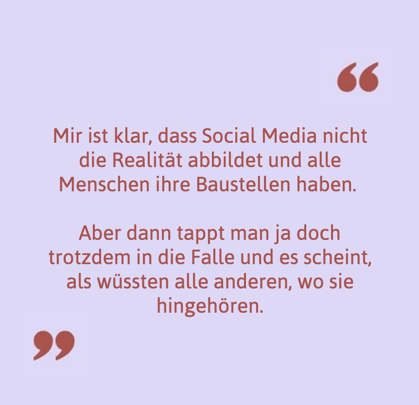 Mir ist klar, dass Social Media nicht die Realität abbildet und alle Menschen ihre Baustellen haben. Aber dann tappt man ja doch trotzdem in die Falle und es scheint, als wüssten alle anderen, wo sie hingehören, zumindest in manchen Bereichen ihres Lebens.