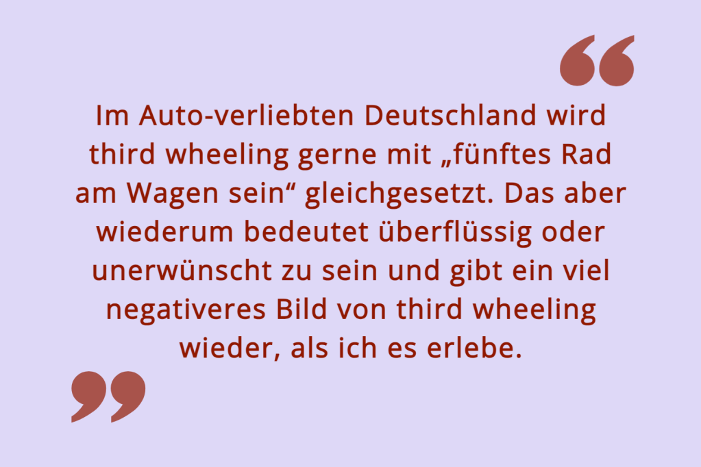 Im Auto-verliebten Deutschland wird third wheeling gerne mit „fünftes Rad am Wagen sein“ gleichgesetzt. Das aber wiederum bedeutet überflüssig oder unerwünscht zu sein und gibt ein viel negativeres Bild von third wheeling wieder, als ich es erlebe. Eigentlich mag ich meine Third-Wheeling-Aktivitäten meistens ganz gerne und wenn mich nicht alle meine befreundeten Pärchen durchgehend angelogen haben, ist es für sie auch nicht unerwünscht oder überflüssig, mit mir Zeit zu verbringen.