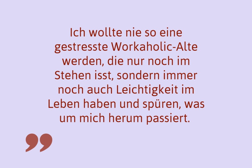Ich wollte nie so eine gestresste Workaholic-Alte werden, die nur noch im Stehen isst, sondern immer noch auch Leichtigkeit im Leben haben und spüren, was um mich herum passiert. Auch wenn mir meine Arbeit Spaß macht und mir viel bedeutet, sie soll bitte nicht mein ganzes Leben ausmachen.