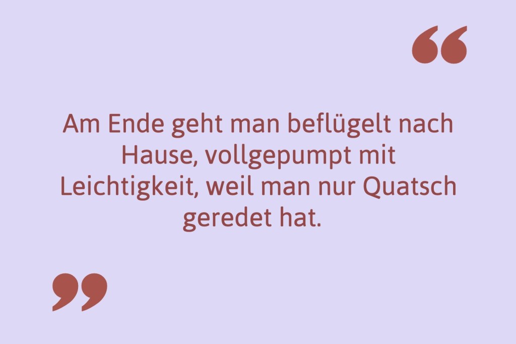 Immer hilfreich: Kaffeedate im Café oder bei jemandem zuhause. Eine Freundin drückt dir eine Tasse mit einer wohlduftenden heißen Flüssigkeit in die Hand und sagt: „Weißt du Cilli, grundsätzlich ist das Leben auch eher scheiße, ABER…“ und dann hagelt es Yogi-Tee Affirmationen, Co-Star Analysen, Karottenkuchenrezeptideen, Geschichten über Heidi als Anime, Analysen über Männerkater (nein, nicht, wenn Männer Kater haben, sondern wenn man Kater von Männern hat) oder vielleicht doch Aktuelles aus der Bibi-und-Tina-Welt („Da kann man ja wirklich was lernen!“). Am Ende vom „Stündchen“, das dann doch eher drei angedauert hat, geht man beflügelt nach Hause, vollgepumpt mit Leichtigkeit, weil man nur Quatsch geredet hat.