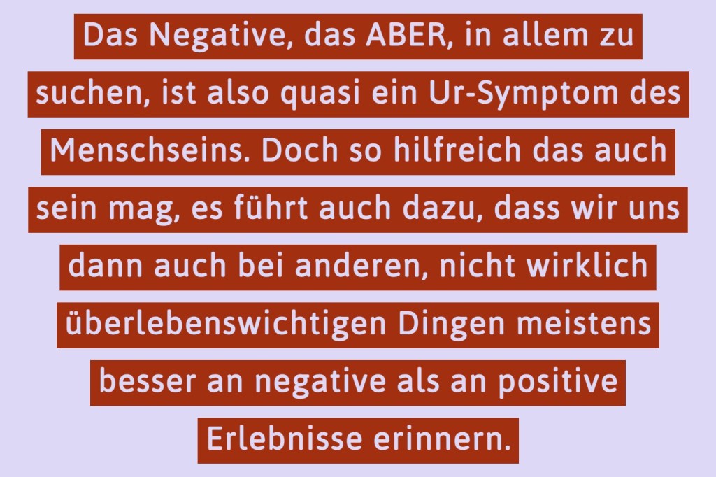 Das Negative, das ABER, in allem zu suchen, ist also quasi ein Ur-Symptom des Menschseins. Doch so hilfreich das auch sein mag, es führt auch dazu, dass wir uns dann auch bei anderen, nicht wirklich überlebenswichtigen Dingen (ja, Hundescheiße zähle ich dazu) meistens besser an negative als an positive Erlebnisse erinnern: Wenn ich in der Uni einen Text vorgetragen habe, bleibt vor allem die eine Person in meinem Kopf, der mein Text nicht ganz so gut gefallen hat. Und wenn ich dann über lange Zeit eigentlich ein solides Leben führe, dann denke ich nur „gerade ist nichts los“, anstatt das wirklich anzuerkennen. Negative Dinge wiegen in unserem Kopf viel schwerer als positive. Meine Therapeutin meinte sogar, dass ein negatives Erlebnis am Tag nur durch mehrere positive Erlebnisse wettgemacht werden kann. In der Psychologie wird dieses Phänomen auch als „Negativity Bias“ bezeichnet.