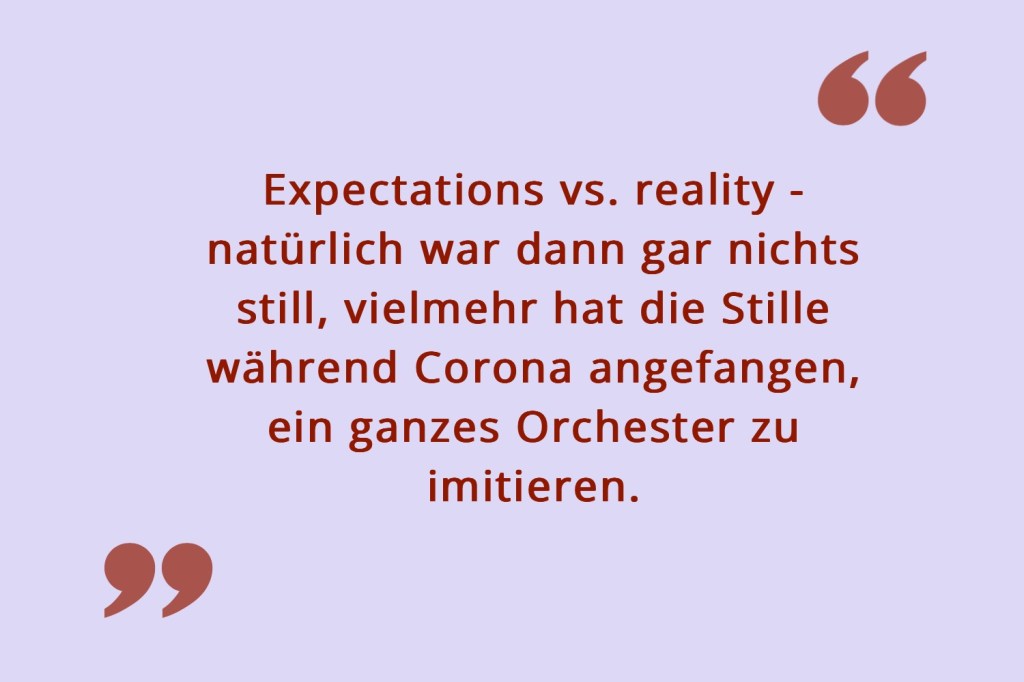Ende des Jahres war es besonders still um mich herum, weil ich eine Woche von Corona gebeutelt, fernab jeglicher Menschen im Schlafzimmer rumhängen musste. Ein Raum in meiner Wohnung, der von Natur aus schon unheimlich still ist, mit seinem Fenster zum Garten, in den sich höchstens mal ein Vögelchen verirrt, kaum aber eine Menschenseele. Dabei waren um mich herum einen Tag vorher noch sehr viele Seelen, als ich auf dem Teamtrip meiner Arbeit war, bei dem ich mir neben vielen tollen Erinnerungen auch Corona als Souvenir mit nach Hause genommen habe. Auf dieser Reise war es oft sehr laut, auf der Tanzfläche oder in der wuseligen Innenstadt von Barcelona. Da habe ich mich tatsächlich manchmal ein bisschen auf die Stille meines menschenlosen Gartens gefreut. Expectations vs. reality – natürlich war dann gar nichts still, vielmehr hat die Stille während Corona angefangen, ein ganzes Orchester zu imitieren.