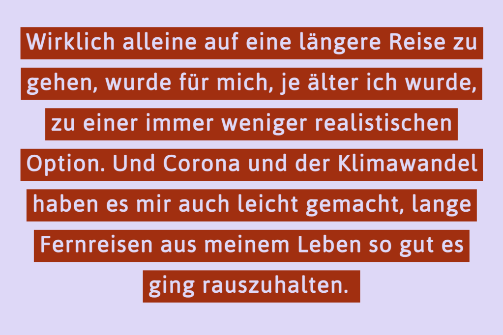 Wirklich alleine auf eine längere Reise zu gehen, wurde für mich, je älter ich wurde, zu einer immer weniger realistischen Option. Und Corona und der Klimawandel haben es mir auch leicht gemacht, lange Fernreisen aus meinem Leben so gut es ging rauszuhalten. Ich habe es mir also in der „Annika“-Schublade bequem gemacht und mir irgendwann einfach eingeredet, ich wäre „einfach nicht der Typ für sowas“.