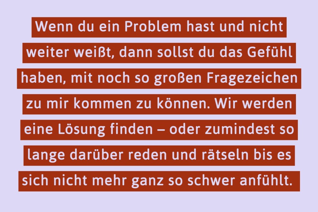 Dabei funktionieren Freund:innenschaften ja genau darüber: Wenn du ein Problem hast und nicht weiter weißt, dann sollst du das Gefühl haben, mit noch so großen Fragezeichen zu mir kommen zu können. Wir werden eine Lösung finden – oder zumindest so lange darüber reden und rätseln bis es sich nicht mehr ganz so schwer anfühlt. Und ich weiß, dass ich genau solche Freund:innenschaften auch habe: Denn, wenn es ganz selten doch vorkommt, dass ich und meine Gefühle und Erlebnisse zum Fokusthema des Gesprächs werden – dass ich mich wirklich öffne in Momenten, in denen ich nicht weiterweiß oder von etwas berichte, bei dem ich selbst noch keine Antworten für mich gefunden habe – dann habe ich auf jeden Fall auch mit einigen Menschen in meinem Leben die Erfahrung gemacht, dass es mir auch weiterhilft, mit ihnen darüber zu sprechen. Dass sich Knoten in meinem Kopf lösen, ich mich verstanden fühle und merke, dass ich nicht alleine mit manchen Alpträumen bin. Doch zu oft halte ich mich eher zurück. Und das hat, glaube ich, mehrere Gründe.